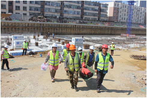 本次演練模擬為施工現(xiàn)場(chǎng)材料堆場(chǎng)出現(xiàn)火情和坍塌,施工人員發(fā)現(xiàn)后立即向項(xiàng)目經(jīng)理報(bào)告,項(xiàng)目經(jīng)理根據(jù)現(xiàn)場(chǎng)情況立即啟動(dòng)應(yīng)急預(yù)案。項(xiàng)目部全員按照應(yīng)急預(yù)案進(jìn)行疏散逃生。醫(yī)療救護(hù)組、安保組、綜合協(xié)調(diào)組等迅速集結(jié),在做了緊急部署后,搶救傷員、滅火行動(dòng)組同步行動(dòng),整個(gè)演練井然有序進(jìn)行。